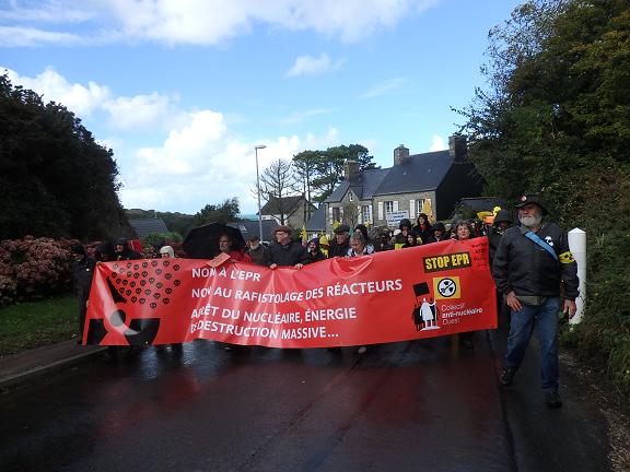 Malgré le contexte extrêmement difficile du à l’état d’urgence et aux mauvaises conditions météo (pluie, grêle et vent), le Collectif anti-nucléaire Ouest a réussi à lever les obstacles qui auraient pu conduire à l’interdiction du rassemblement organisé à Flamanville ce week-end les 1er et 2 octobre 2016. Il a réussi à mobiliser plus de 5000 marcheurs jusqu’à l’entrée du chantier de l’EPR sans compter ceux venus au concert du soir, et ceux qui ont participé aux conférences-débats du dimanche matin sur les risques du nucléaire et les alternatives. Les manifestants étaient venus principalement de Normandie, Bretagne et Pays de Loire, accompagnés de délégations venues de points « chauds » des luttes anti-nucléaires (Bure, Fessenheim, Hinkley Point).
